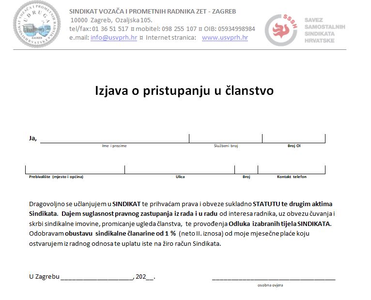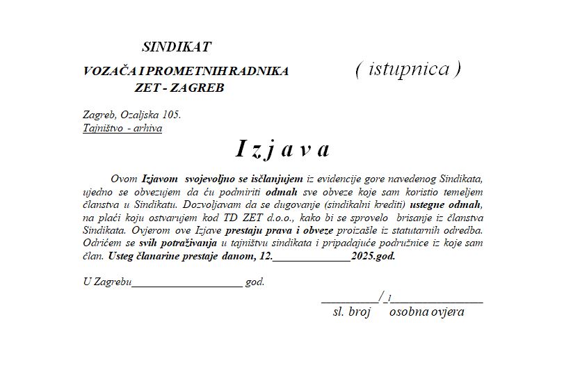 Nadalje, na našoj web stranici vezano za pristup i istup članova iz sindikata, sve ove godine bilo je moguće preuzeti samo Pristupnicu dok je za istupanje iz SVPR ZET Zagreb bio neophodan osobni dolazak u tajništvo sindikata.